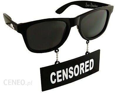 Okulary z przyciemnianymi szkiełkami.Do oprawki przyczepiona jest na łańcuszkach tabliczka z napisem Censored.