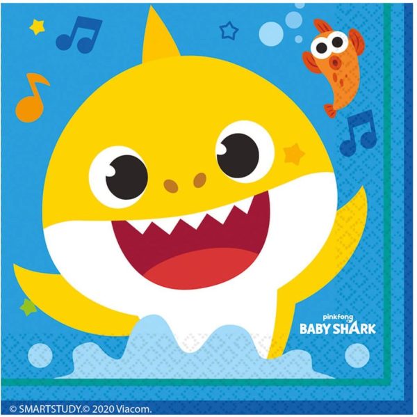 Serwetki urodzinowe z zestawu Baby Shark.Wymiary: 33 cm x 33 cm (po rozłożeniu).Opakowanie: 16 szt.