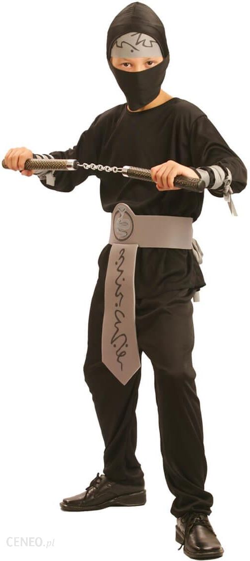 Strój Wojownika ninja dla chłopca.W komplecie: koszula, spodnie, pas, kaptur i maska.Rozmiar: M – 120/130 cm.