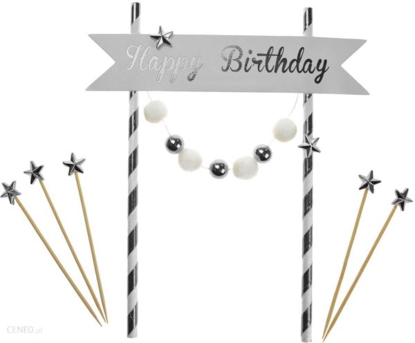 W zestawie:- topper na tort ze srebrnymi i białymi pomponikami oraz napisem Happy Birthday w kolorze srebrnym,- pikery srebrne gwiazdki (5 szt.)Idealna dekoracja tortu na urodziny.Wymiary: .Opakowanie: 6 szt.