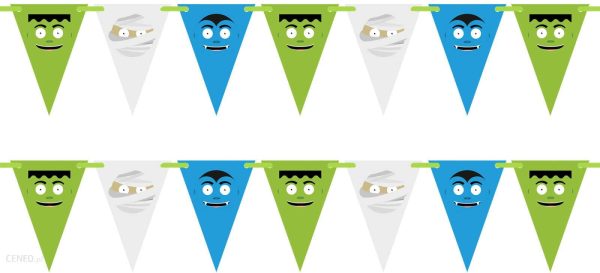 Baner flagi z potworkami: wampirem, mumią i Frankensteinem na Halloween z zieloną wstążką.Do baneru można dołączyć dowolny element, baner jest składany samodzielnie.Długość wstążki: 500 cm. Wysokość flagi: 15 cm.Opakowanie: 1 szt.