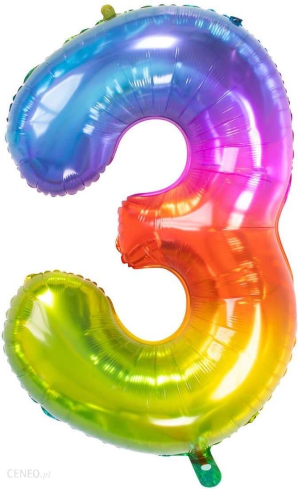 Balon foliowy cyfra trzy tęczowy, posiada specjalne uchwyty ułatwiające montaż.Przód jest transparentny, natomiast tył balonu jest srebrny.Wielkość: 86 cm.Opakowanie: 1 szt.