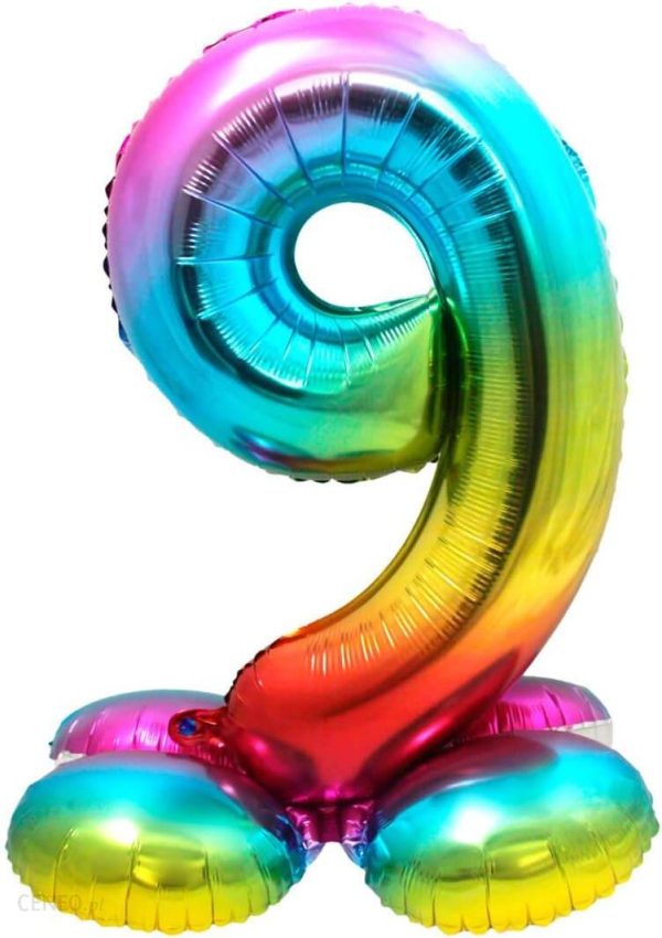 Balon foliowy cyfra dziewięć 9 w kolorach tęczy z podstawą.Wysokość: 81 cm.Opakowanie: 1 szt.Balony są przeznaczone do napełnienia powietrzem.