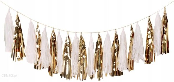 Girlanda z pomponami w kolorach: białym i metalizowanym złotym.Wysokość frędzla: 36 cm.Długość całkowita: 250 cm.Ilość pomponów: 20 szt.Opakowanie 1 szt.