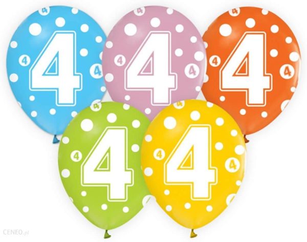 Balony z cyframi 4, pastel mix 5 szt. Opakowanie zawiera 5 sztuk balonów.Prawidłowo napompowany balon powinien mieć średnice 30 centymetrów (12 cali). Balony te bardzo dobrze zachowują swój kształt i doskonale nadają się do wykonania dekoracji na przyjęcie urodzinowe, czy inną uroczystość.