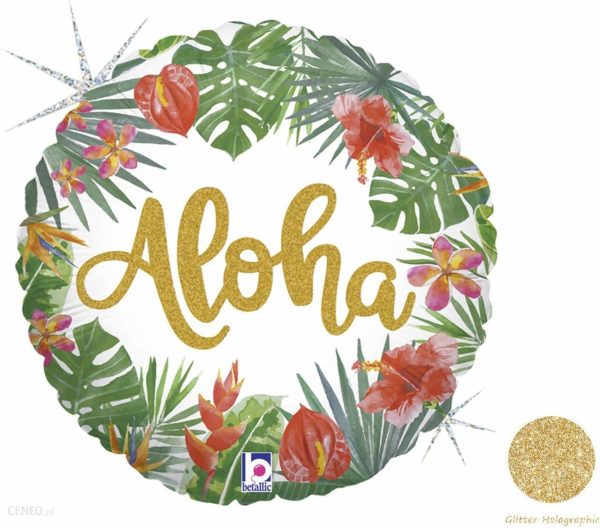 Balon foliowy na imprezę w stylu hawajskim z nadrukiem liści tropikalnych i kwiatów anturium oraz złotym, brokatowym napisem Aloha.Średnica: 46 cm.Opakowanie 1 szt.Balon można napełniać zarówno powietrzem jak i helem.