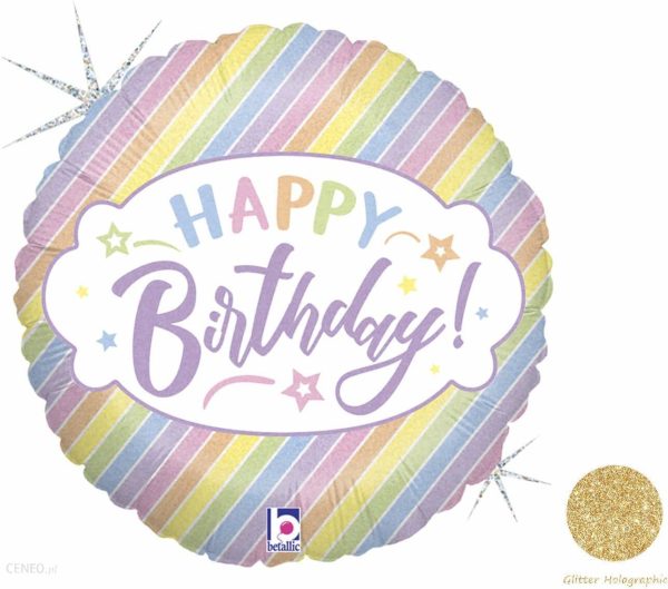 Balon foliowy z nadrukiem kolorowych, pastelowych pasków i napisem Happy Birthday, idealny na urodziny.Średnica: 46 cm.Opakowanie: 1 szt.Balon można napełniać zarówno powietrzem jak i helem.