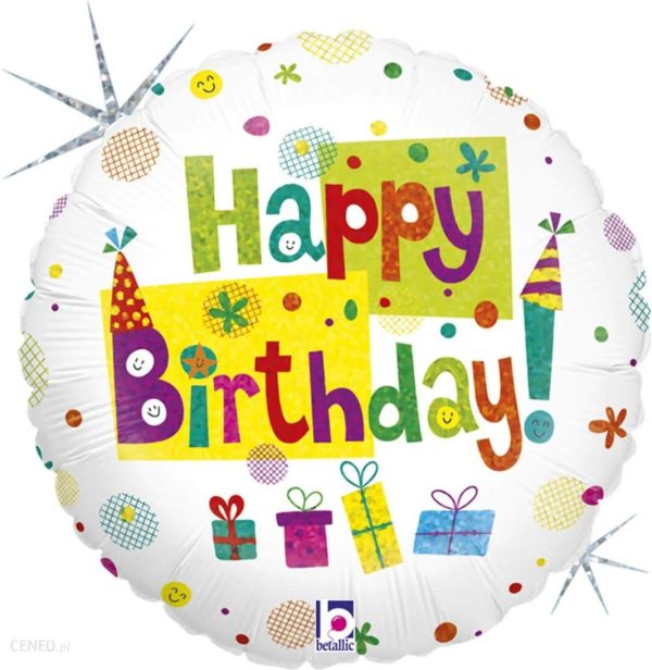 Balon foliowy w kolorze białym z kolorowym nadrukiem i napisem Happy Birthday.Średnica: 46 cm.Opakowanie 1 szt.Balon można napełniać zarówno powietrzem jak i helem.