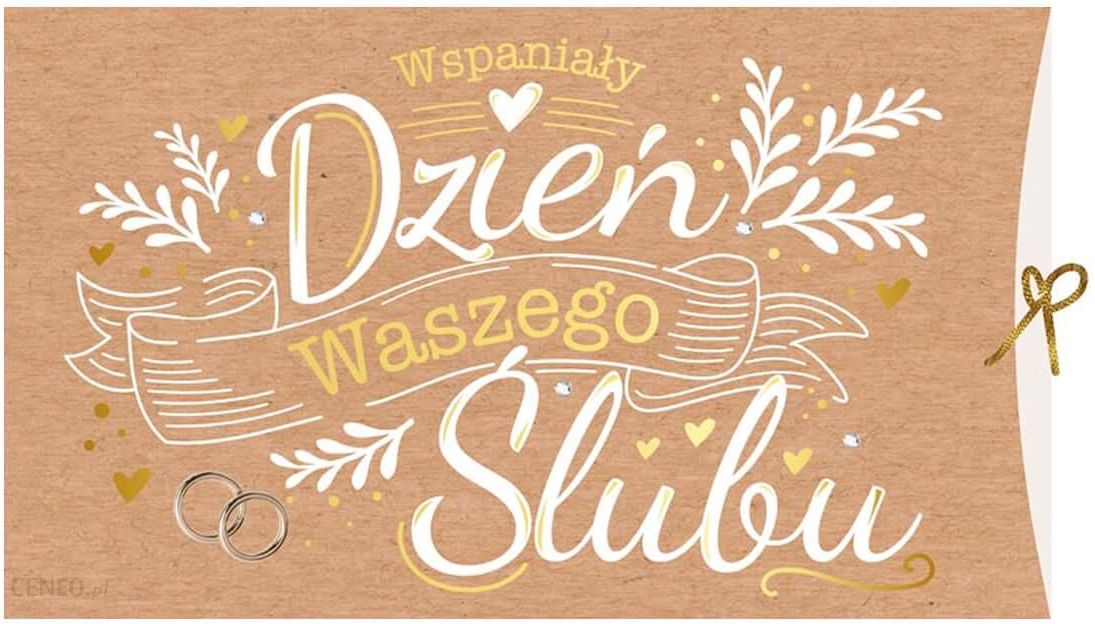 Kartka okolicznościowa z napisem „Wspaniały dzień Waszego ślubu” z życzeniami w środku.W zestawie koperta.Wymiary: x cm.Idealny dodatek do prezentu ślubnego dla Nowożeńców.