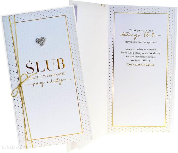 Kartka okolicznościowa z napisem „Ślub pięknej i wyjątkowej Pary Młodej”.W zestawie biała koperta.Wymiary: 11,4 x 21,5 cm.Idealny dodatek do prezentu ślubnego dla Nowożeńców.