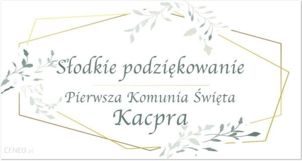 Samoprzylepne etykiety personalizowane na pudełka na ciasto na I Komunię Świętą.Wielkość: 8,5 cm x 4,5 cm.Opakowanie: 30 szt.Tekst do etykiet proszę umieścić w wiadomości do zamówienia. Należy podać imię dziecka.