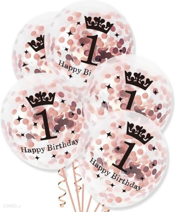 Balony transparentne z różowo złotym konfetti i nadrukiem na pierwsze urodzinki.Średnica: 30 cm.Opakowanie: 100 szt.