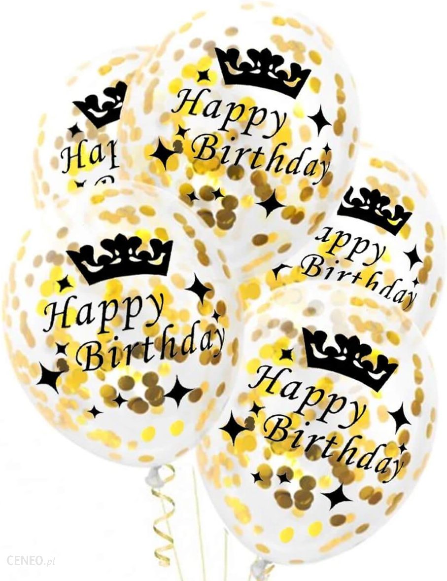 Balony transparentne ze złotym konfetti i czarnym nadrukiem Happy Birthday.Średnica: 30 cm.Opakowanie: 3 szt.