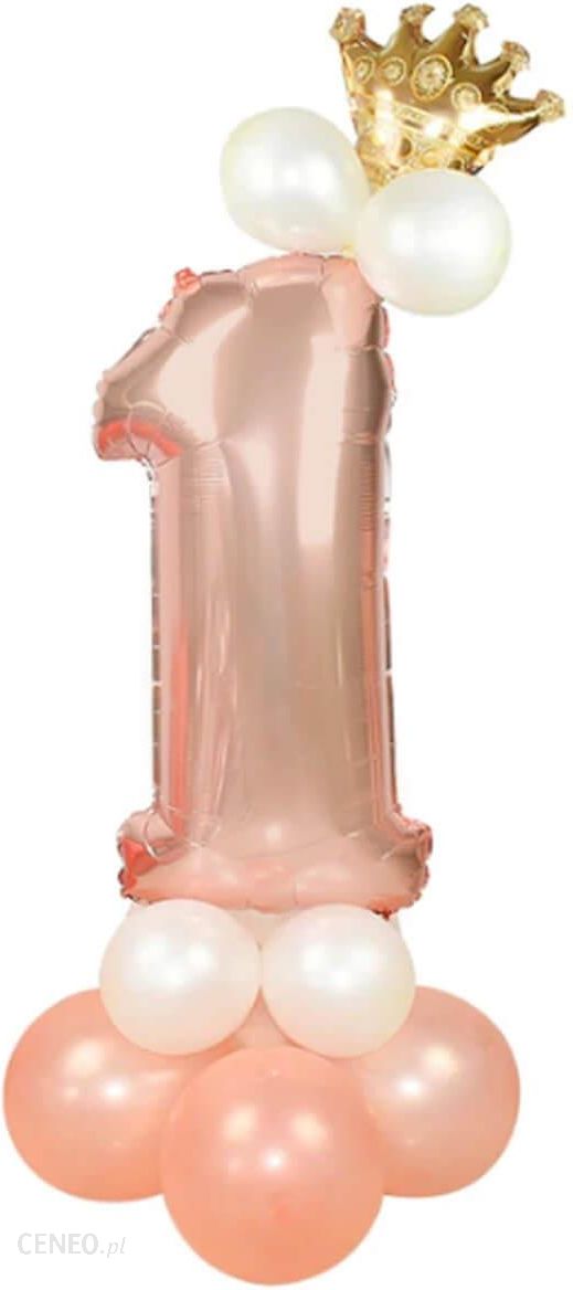 W skład zestawu wchodzą balony:- lateksowe białe 5 cali (6 szt.),- lateksowe różowe złoto 10 cali (4 szt.),- foliowa cyfra 1 70 cm (1 szt.),- foliowa korona 30 cm (1 szt.),- 20 szt. kleju,- 5 m taśmy- klips balonowy.Wysokość: 110 cm.