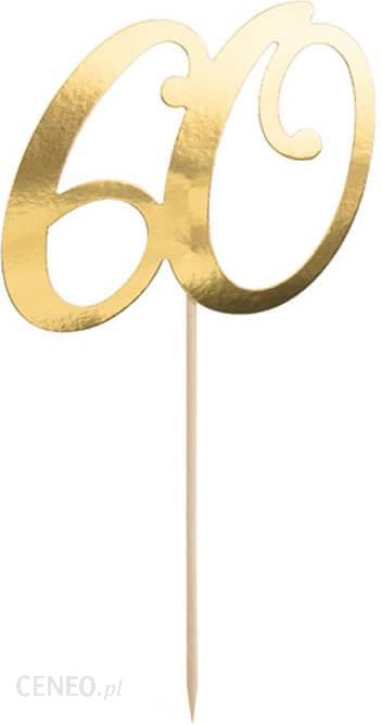 Dekoracja papierowa liczba 60 w kolorze złotym metalizowanym na drewnianym patyczku, dekoracja tortu bądź muffinek na sześćdziesiąte urodziny.Wysokość topperu: 20,5 cm.Wysokość liczby: 10 cm.Opakowanie: 1 szt.