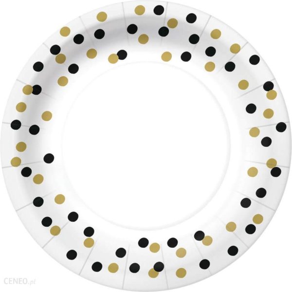 Papierowe talerzyki urodzinowe w kolorze białym z nadrukiem złotych i czarnych kropek.Średnica: 18 cm.Opakowanie: 10 szt.