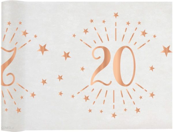 Bieżnik na stół biały z nadrukiem cyfry 20 w kolorze różowego złota z zestawu Sparkling. Idealny na dwudzieste urodziny, wykonany z poliestru.Szerokość: 30 cm.Długość: 5 m.Opakowanie 1 szt.