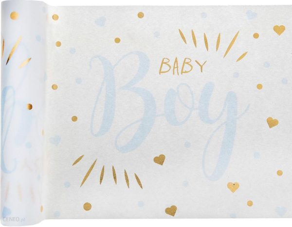 Bieżnik na stół w kolorze białym z napisem Baby Boy, idealny na baby shower lub roczek chłopca.Wykonany z włókniny poliestrowej.Szerokość: 28 cm.Długość: 3 m.Opakowanie 1 szt.