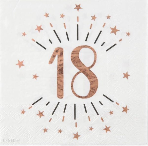 Serwetki 3-warstwowe z nadrukiem 18 – osiemnastka w kolorze różowego złota z zestawu Sparkling. Idealne na osiemnaste urodziny.Wymiary: 33 cm x 33 cm (po rozłożeniu).Opakowanie: 10 szt.