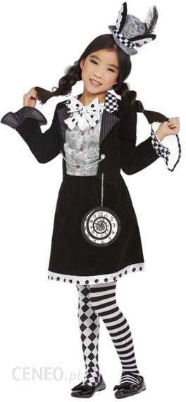 Czarna sukienka z wszytą kamizelką oraz kokardą.W pasie wszyta gumka.Brokatowa zawieszka na rzep w kształcie zegara na łańcuszku.Ozdobny łańcuszek zapinany na rzep.Czarna opaska w kształcie cylindra.Ozdobiona dodatkowo uszami w kropki oraz piórkiem.