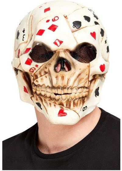 Maska lateksowa w kolorze beżowym.Ozdobiona kartami czarno-czerwonymi.Posiada otwory na oczy, nos i usta.Rozmiar uniwersalny, zakrywa całą głowę.