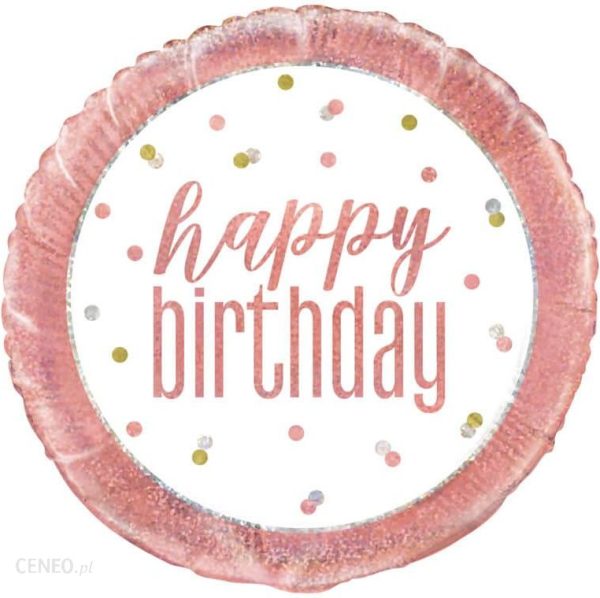 Balon foliowy biały z nadrukiem Happy Birthday na urodziny w kolorze różowego złota.Wielkość: 46 cm.Opakowanie: 1 szt.