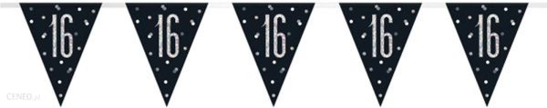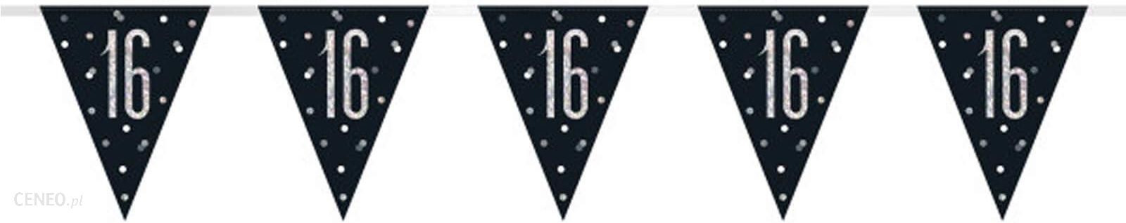 Baner w kolorze czarnym ze srebrnym holograficznym nadrukiem 16, idealna dekoracja na szesnaste urodziny.Długość: 274 cm.Opakowanie: 1 szt.