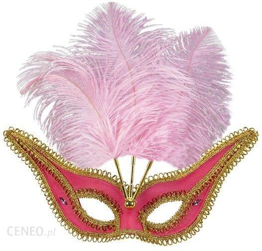 Maska Karnawałowa Różowa, karnawał, maska w kolorze czerwono-złotym, ozdobiona złotą lamówką i różowymi piórami, w masce wycięte otwory na oczy70% PVC, 25% Polyester, 5% Feather