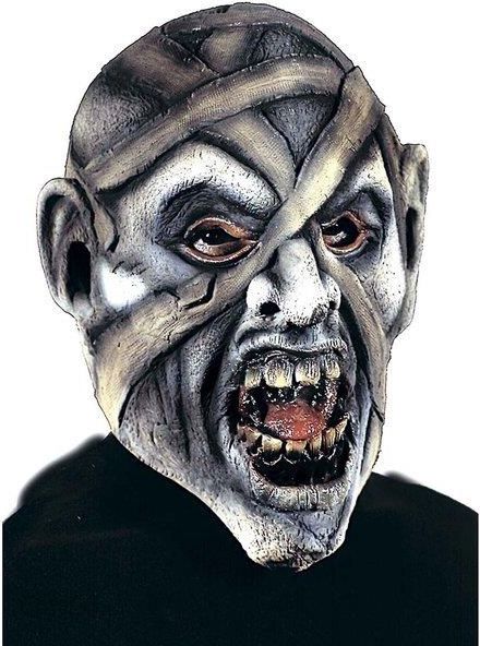 Maska lateksowa w kolorze ciemnym beżowym.Przedstawia głowę mumii z zębami.Posiada otwory na oczy, nos i usta.