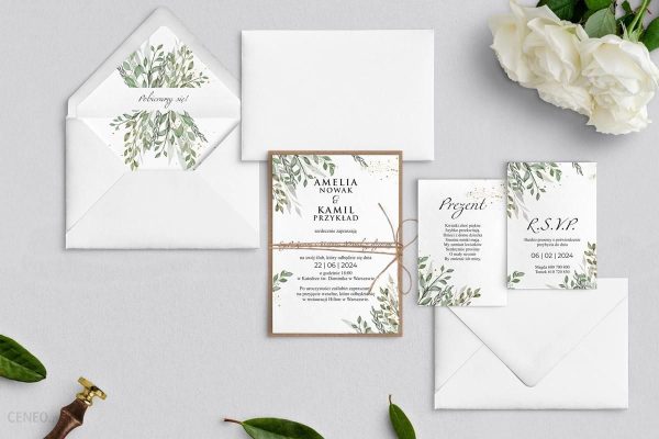 Zaproszenia jednokartkowe Leaves to jeden z trendów tego sezonu. Połączenie kolorów zielonych z delikatnymi, pastelowymi odcieniami kwiatów znakomicie stworzy spójną całość dekoracji wesela. Liście eukaliptusa w zaproszeniach są nowoczesnym elementem zdobiącym, dodaje szyku i elegancji.Na zaproszeniu jest miejsce na informację o ślubie oraz o przyjęciu weselnym.Zaproszenie drukujemy na sztywnych papierach o gramaturach od 250 do 350 gr. Rozmiar: ok. 105 x 148 mm.W cenie zaproszenia:- Karta a6 zadrukowana jednostronnie,- Koperta biała listowa o gramaturze 80g gratis,- Pełna personalizacja zaproszeń (treści, nazwisk gości),- Personalizacja kopert (imion i nazwisk gości),- Do wyboru papier gładki, w prążki lub o fakturze skóry w kolorze białym.Dodatkowo można zakupić:- Papier ozdobny/podklejkę w różnych kolorach do wyboru,- Aplikację: sznurek lub satynową wstążkę w różnych kolorach do wyboru,- Dodatkową kartę z nadrukowanymi imionami lub cytatem,- Dodatkowe wkładki: jedna lub dwie sztuki,- Koperty: Biała z naklejką, Eco z naklejką lub inny KOLOR KOPERTY.W cenę zaproszenia nie jest wliczona wklejka do koperty widoczna na zdjęciach, można je zamówić dodatkowo tutaj – WKLEJKA DO KOPERTYGdy zamówisz już nasze zaproszenia, wypełnij poniższy formularz. Ważne, aby wypełnić formularz w programie Adobe Reader. Formularz wypełniony w przeglądarce internetowej nie zapisze danych. Gdy będziesz gotowy, wypełniony formularz wyślij na nasz email: sklep@dodatkiweselne.pl w tytule proszę koniecznie podać NR.ZAMÓWIENIA i NAZWISKOPo dokonaniu zamówienia wysyłamy projekt w ciągu 2 dni roboczych. Zaproszenia wykonujemy w ciągu max 7 dni roboczych. Tylko tyle musisz czekać, aby Twoje zaproszenia zostały wykonane i wysłane do Ciebie. Czas realizacji liczymy od dnia wpłynięcia należności na konto (po uprzednim zatwierdzeniu przesłanego przez nas projektu zaproszenia).Papier ozdobny/podklejka:Aplikacja: