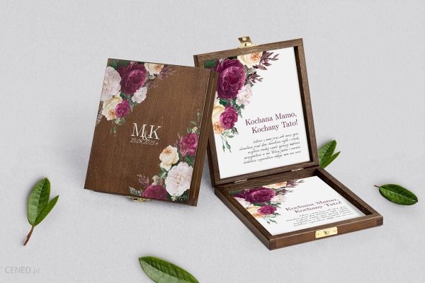 DREWNIANE ZAPROSZENIE LUB PROŚBA O BŁOGOSŁAWIEŃSTWO DLA RODZICÓWPiękne drewniane zaproszeniew formie eleganckiego pudełeczka to nie tylko oryginalny sposób na poinformowanie o uroczystości, ale też wyjątkowa i idealna pamiątka, która pozostanie na lata.Spersonalizowane zaproszenie będzie miłą niespodzianką dla zaproszonych.Góra pudełka jest nadrukowana i może przedstawiać dowolny motyw zaproszenia z kolekcji ślubnych poponowanych na stronie + personalizacja.Rozmiar ok. ok. 150x175x25 mm,Produkty wykonane są z naturalnego drewna ,mogą pojawiać się przebarwienia czy sęki, co nadaje każdemu produktowi charakteru i niepowtarzalności.Gdy złożysz zamówienie, wypełnij poniższy formularz. Ważne, aby wypełnić formularz w programie Adobe Reader. Formularz wypełniony w przeglądarce internetowej nie zapisze danych. Gdy będziesz gotowy, wypełniony formularz wyślij na nasz email: sklep@dodatkiweselne.pl w tytule proszę koniecznie podać NR.ZAMÓWIENIA i NAZWISKOPo dokonaniu zamówienia wysyłamy projekt w ciągu 2 dni roboczych. Zamówienie wykonujemy w ciągu max 7 dni roboczych. Czas realizacji liczymy od dnia wpłynięcia należności na konto (po uprzednim zatwierdzeniu przesłanego przez nas projektu ).