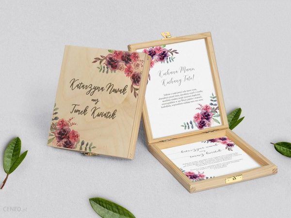 DREWNIANE ZAPROSZENIE LUB PROŚBA O BŁOGOSŁAWIEŃSTWO DLA RODZICÓWPiękne drewniane zaproszeniew formie eleganckiego pudełeczka to nie tylko oryginalny sposób na poinformowanie o uroczystości, ale też wyjątkowa i idealna pamiątka, która pozostanie na lata.Spersonalizowane zaproszenie będzie miłą niespodzianką dla zaproszonych.Góra pudełka jest nadrukowana i może przedstawiać dowolny motyw zaproszenia z kolekcji ślubnych poponowanych na stronie + personalizacja.Rozmiar ok. ok. 150x175x25 mm,Produkty wykonane są z naturalnego drewna ,mogą pojawiać się przebarwienia czy sęki, co nadaje każdemu produktowi charakteru i niepowtarzalności.Gdy złożysz zamówienie, wypełnij poniższy formularz. Ważne, aby wypełnić formularz w programie Adobe Reader. Formularz wypełniony w przeglądarce internetowej nie zapisze danych. Gdy będziesz gotowy, wypełniony formularz wyślij na nasz email: sklep@dodatkiweselne.pl w tytule proszę koniecznie podać NR.ZAMÓWIENIA i NAZWISKOPo dokonaniu zamówienia wysyłamy projekt w ciągu 2 dni roboczych. Zamówienie wykonujemy w ciągu max 7 dni roboczych. Czas realizacji liczymy od dnia wpłynięcia należności na konto (po uprzednim zatwierdzeniu przesłanego przez nas projektu ).