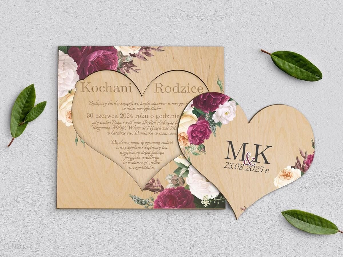 DREWNIANE ZAPROSZENIE Z SERCEM DLA RODZICÓW lub prośba o błogosławieństwo. Piękne drewniane zaproszenie to nie tylko oryginalny sposób na poinformowanie o uroczystości, ale też wyjątkowa i idealna pamiątka, która pozostanie na lata.Spersonalizowane zaproszenie będzie miłą niespodzianką dla zaproszonych.Rozmiar ok. 145×145 mm,Kolor: naturalnyGrubość: 3 mmRozmiar pasującej koperty: 15x15cmGrawer, nadruk i cięcie laseroweProdukty wykonane są z naturalnej sklejki liściastej, na której mogą pojawiać się przebarwienia czy sęki, co nadaje każdemu produktowi charakteru i niepowtarzalności.Gdy złożysz zamówienie, wypełnij poniższy formularz. Ważne, aby wypełnić formularz w programie Adobe Reader. Formularz wypełniony w przeglądarce internetowej nie zapisze danych. Gdy będziesz gotowy, wypełniony formularz wyślij na nasz email: sklep@dodatkiweselne.pl w tytule proszę koniecznie podać NR.ZAMÓWIENIA i NAZWISKOPo dokonaniu zamówienia wysyłamy projekt w ciągu 2 dni roboczych. Zamówienie wykonujemy w ciągu max 7 dni roboczych. Czas realizacji liczymy od dnia wpłynięcia należności na konto (po uprzednim zatwierdzeniu przesłanego przez nas projektu ).